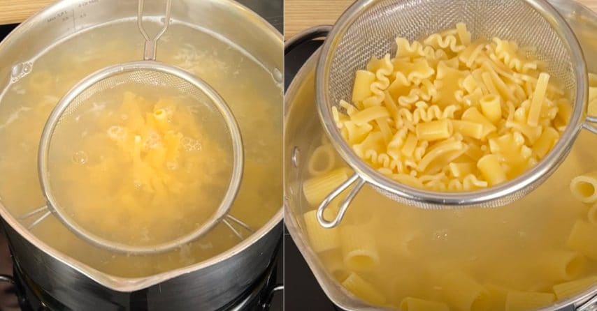 Vuoi cuocere due tipi di pasta diversa in una sola pentola? Capita a volte di dover preparare contemporaneamente due tipologie di pasta per assecondare gusti diversi oppure hai necessità di pesare la pasta e vuoi la certezza di mangiare il giusto peso. Prova allora questo trucchetto con il colino: nell’acqua in cui sta già cuocendo la pasta, aggiungi un colino e versaci dentro il secondo tipo di pasta. In questo modo cuoceranno entrambe nella stessa acqua contemporaneamente e non dovrai utilizzare due pentole.