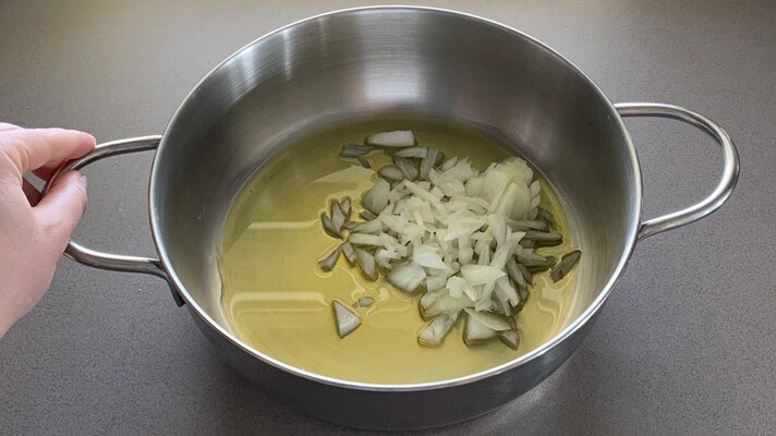 Scalda un giro d'olio in una padella, aggiungi la cipolla, mondata e tritata grossolanamente al coltello 1, e lasciala appassire su fiamma dolce.