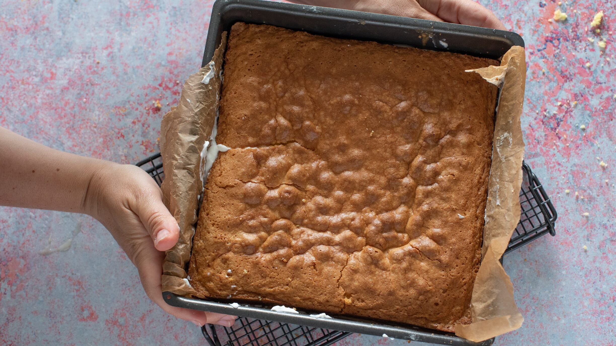 Versate il composto ottenuto in una teglia quadrata da 23 cm di lato, ben imburrata 5, e cuocete in forno già caldo a 175 °C per circa 45 minuti (modalità statico).