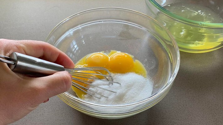 Nel frattempo, in un altro recipiente, lavora i tuorli con lo zucchero fino a ottenere una crema liscia e omogenea, quindi trasferiscila nel pentolino con il composto di cioccolato ancora caldo 3 e mescola per bene con una frusta.