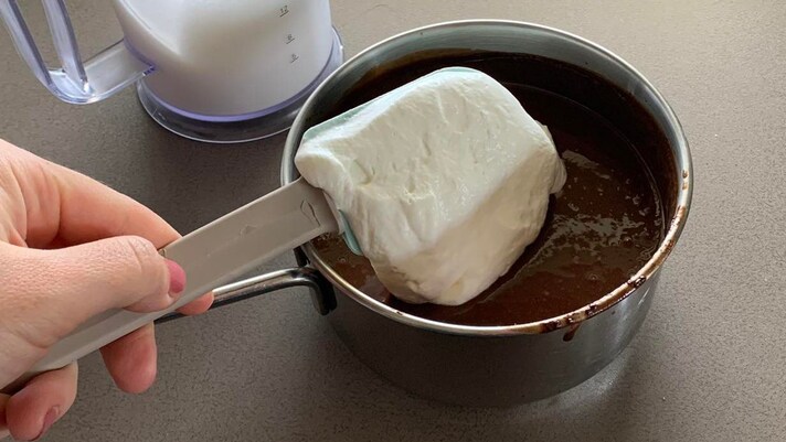 Sistema la panna fresca liquida in una ciotola e lavorala con le fruste elettriche fino a montarla leggermente: dovrà essere morbida e spumosa, non troppo compatta. Procedi quindi a incorporare pian piano la panna al composto di cioccolato 6, mescolando con una spatola con movimenti dal basso verso l'alto così da non smontarlo.