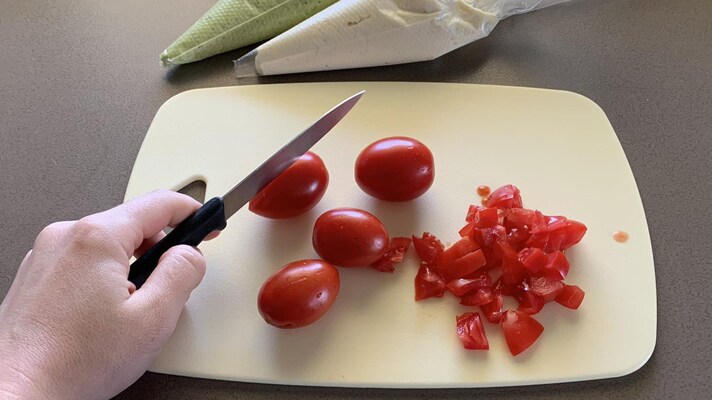 Lava e asciuga i pomodorini, tagliali a cubetti di circa un cm di lato 4.