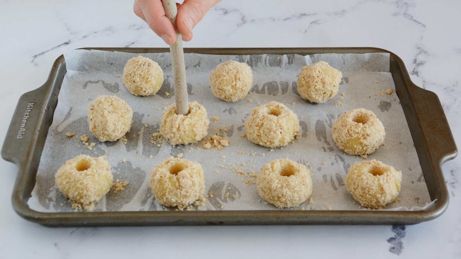 Man mano che sono pronti, disponi i dolcetti su una teglia con carta forno e realizza la fossetta al centro con il polpastrello o con il manico di un mestolo di legno 9; quindi metti in frigo e fai rassodare per circa mezz'ora.