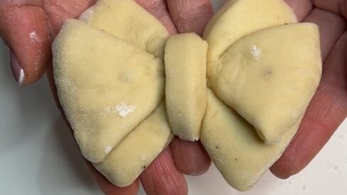 Stendi ogni pallina e fai 7 tagli come vedi in video 4, formando un fiocchetto 5. Preriscalda il forno a 180 °C e procedi con l'ultima lievitazione di 30 minuti. Cuoci per 8-10 minuti a 180 °C. Sforna e spolverizza con zucchero a velo 6.