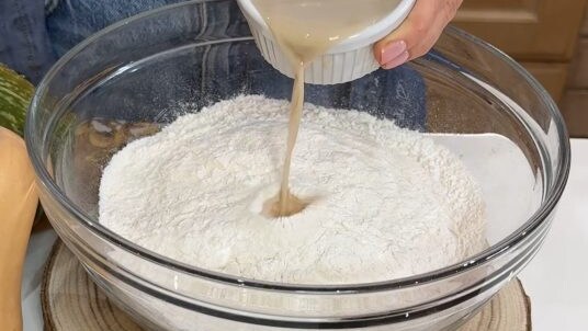 In un contenitore capiente, versa: la farina, poi sciogli il lievito nel latte tiepido 1 e unisci anche lo zucchero 2. A questo punto versa il composto liquido nella farina 3.