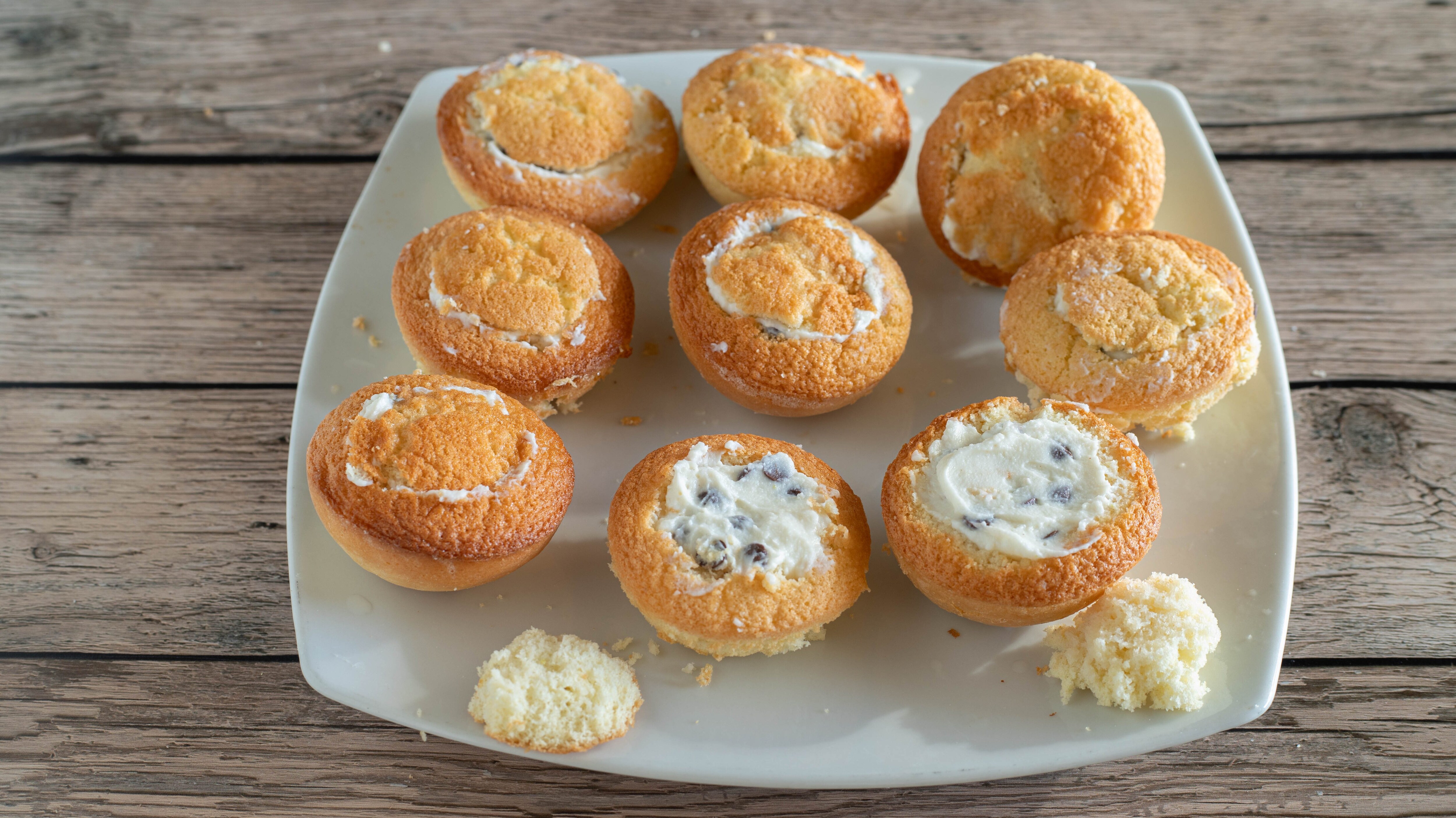 Riempi le cassatine con la crema di ricotta e richiudi con le parti tagliate di pan di Spagna 8.