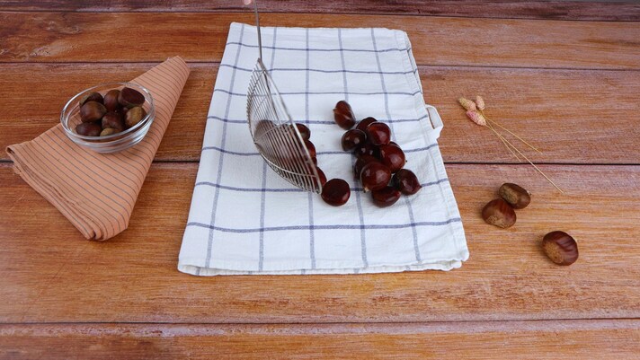 Trascorso il tempo indicato, preleva le castagne con un mestolo forato, sistemale su un telo di cotone pulito 3 e asciugale con cura.