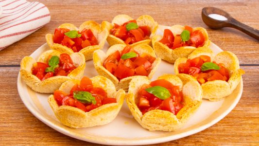 I cestini di pane al pomodoro sono un antipasto velocissimo e sfizioso, realizzato solo con pancarrè, pomodorini, sale, olio extravergine di oliva e basilico. Una preparazione semplice e scenografica da proporre al posto della classica bruschetta, ottima da servire anche per un aperitivo o un buffet. In pochissimo tempo realizzerai dei cestini croccanti e dorati fuori che puoi arricchire con gli ingredienti che preferisci: puoi, ad esempio, aggiungere ai pomodorini anche delle olive tagliate a rondelle oppure optare per la farcitura che più ti piace, in base alle tue preferenze e alla disponibilità. Ecco come prepararli in semplici passaggi.