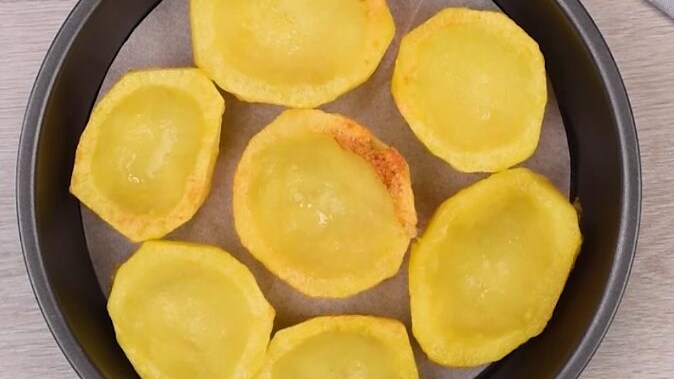 Adagiatele in uno stampo circolare rivestito con carta forno 7. Riempite le patate con il formaggio morbido grattugiato, il pollo condito e il concentrato di pomodoro sciolto nell’acqua. Coprite con altro formaggio grattugiato e i pomodorini, quindi cuocete in forno a 180 °C per 30 minuti 8. Una volta pronti, lasciateli intiepidire. I vostri cestini di patate fritte e pollo sono pronti per essere serviti 9.