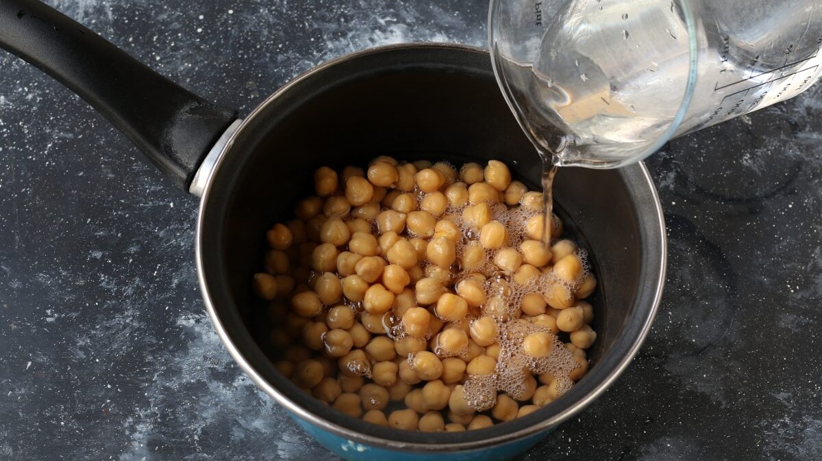 Cuoci i ceci per circa 2 ore, poi metti da parte due o tre mestoli di acqua di cottura 3, scola i legumi e condiscili con un pizzico di sale.