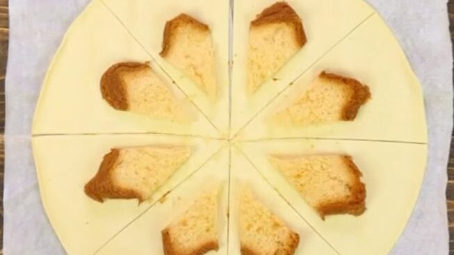 Utilizza più fette di pandoro per realizzare un numero maggiore di cornetti: per ogni fetta tagliata a stella un rotolo di pasta sfoglia. Se preferisci, puoi sostituire pandoro con il panettone, in base alla disponibilità.
