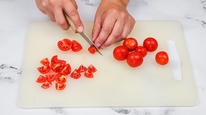 Nel frattempo, occupati dei pomodorini: lavali e tagliali in quarti o a spicchi 4. Noi abbiamo usato i piccadilly, ma puoi scegliere anche datterini, ciliegini o un'altra varietà di tuo gusto.