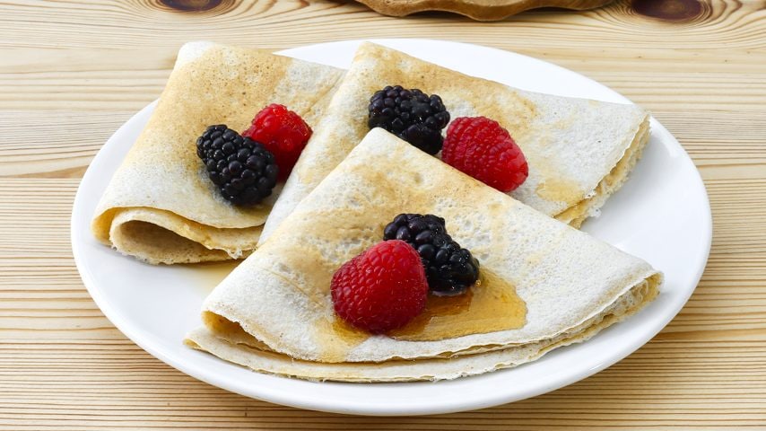 Servi le crêpes con frutti di bosco freschi e sciroppo d’acero 6 o come più ti piace.