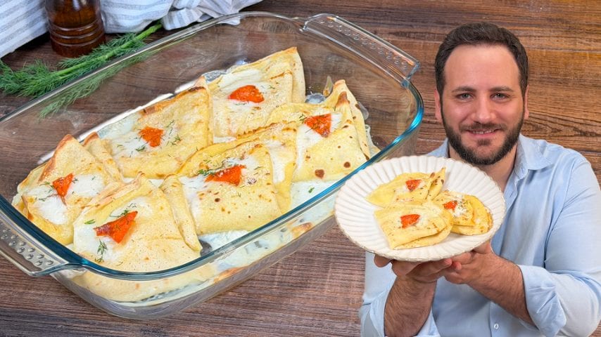 Le crespelle, preparate qui dal nostro Elpidio con una pastella liscia e priva di grumi ottenuta amalgamando insieme farina, acqua, latte, uovo, sale e olio extravergine di oliva, vengono farcite con un ripieno goloso a base di ricotta vaccina, salmone affumicato a pezzetti e aneto. Ricoperte con besciamella e parmigiano grattugiato e cotte quindi in forno, conquisteranno tutti per la consistenza cremosa al morso e il sapore irresistibile.