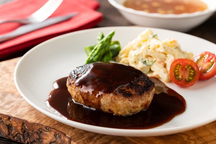 Si tratta del classico hamburger tanto celebre nel mondo occidentale. Viene preparato con carne trita di maiale e manzo e aromatizzata con spezie e aglio. Solitamente gli si dà una forma più allungata per somigliare di più a una sorta di bistecca e viene servita con una salsa demi-glace e un‘insalata di patate fredde.