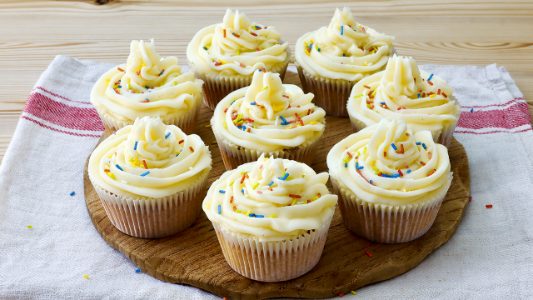 I cupcake sono dei dolcetti preparati con un impasto a base di burro, zucchero, uova, farina e lievito per dolci, aromatizzato con estratto di vaniglia. Morbidi e golosi, vengono poi guarniti con i più svariati frosting: nel nostro caso, abbiamo scelto una voluttuosa crema al burro e completato la decorazione con codette colorate. La ricetta è di origine americana e il loro nome deriva dalla dimensione del dolce, grande quanto un "cup", cioè una tazzina.