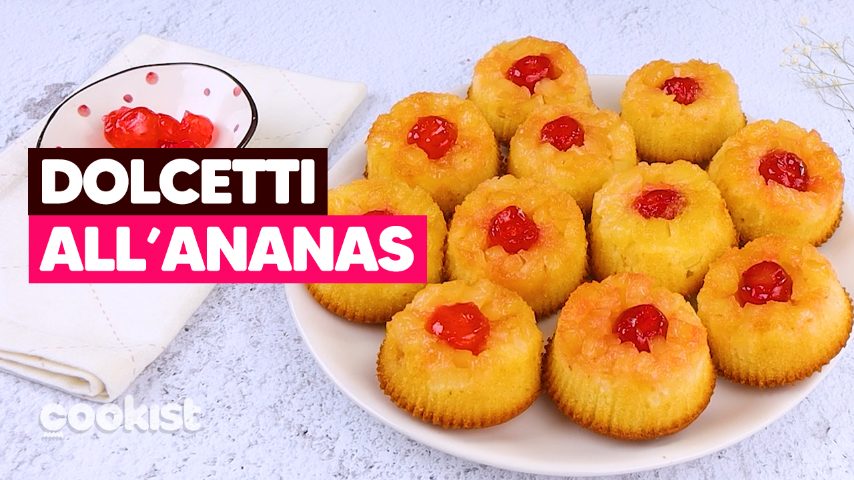 I dolcetti all'ananas sono una ricetta semplice e genuina, ideale da gustare a colazione insieme a una tazza di latte caldo o da proporre per la merenda di grandi e piccini. Si preparano con un impasto a base di uova, burro, zucchero, farina, vaniglia, lievito e succo di ananas, che viene distribuito nei pirottini già riempiti con burro fuso, zucchero di canna, ciliegie candite e pezzetti di ananas fresco.