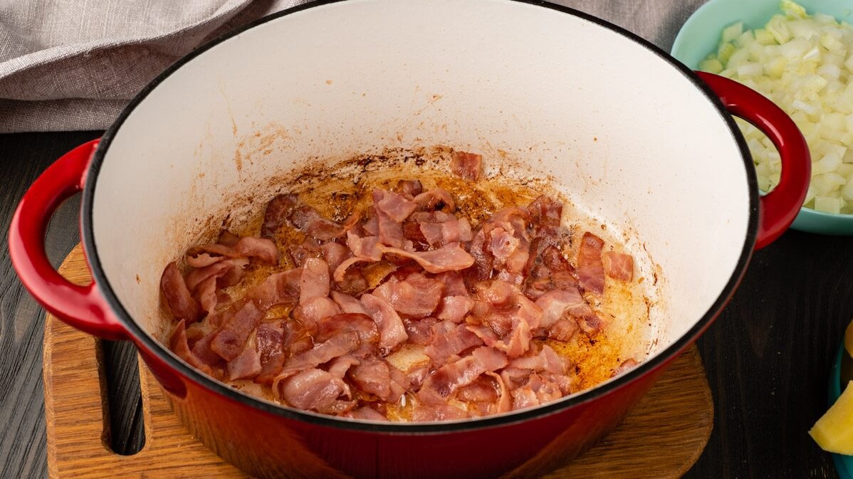 In una pentola capiente, meglio se di coccio, fai rosolare appena la pancetta in un filo di olio extravergine 1.
