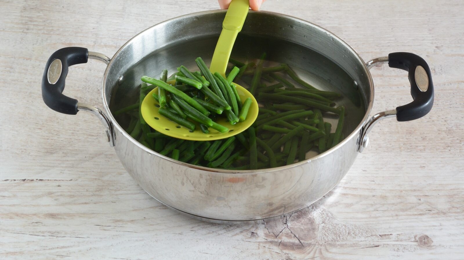 Porta a bollore abbondante acqua salata in una pentola, poi immergi i fagiolini 2 e cuoci per circa 15 minuti: puoi prolungare la cottura se li preferisci più morbidi.