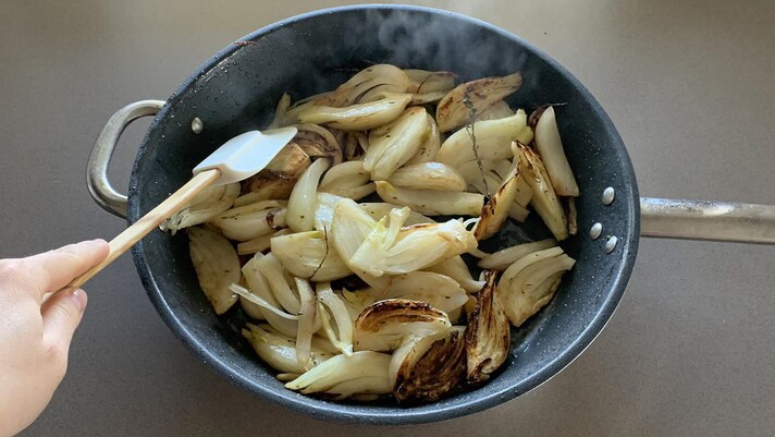 Per evitare che i finocchi si attacchino al fondo della padella, ti suggeriamo di mescolarli spesso con un mestolo di legno oppure, in alternativa, puoi farli ammorbidire, coperti con un coperchio, con un goccino di acqua o un mestolino di brodo vegetale.