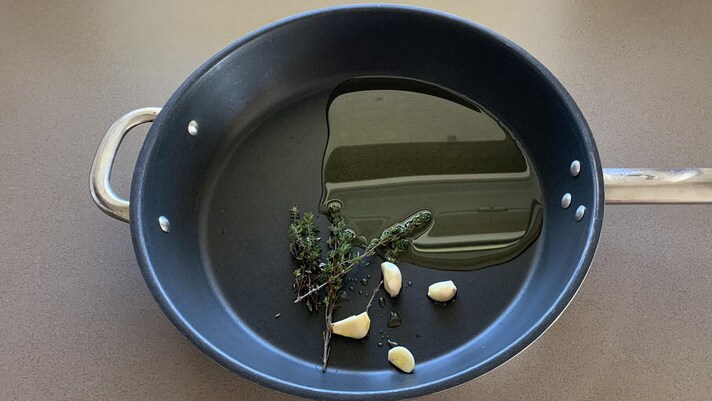 In una padella capiente fai imbiondire l'aglio con un filo generoso d'olio extravergine di oliva e qualche rametto di timo 3.