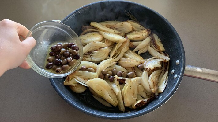 Nella nostra ricetta i finocchi, mondati e ridotti a fette di un cm di spessore, vengono fatti rosolare in un tegame con un soffritto di aglio e olio e un rametto di timo, e arricchiti poi, a qualche minuto dal termine della cottura, con una manciata di olive taggiasche snocciolate: in questo modo, grazie alla rosolatura veloce, gli ortaggi si ammorbidiranno sul fuoco al punto giusto risultando al tempo stesso teneri e croccanti al morso.