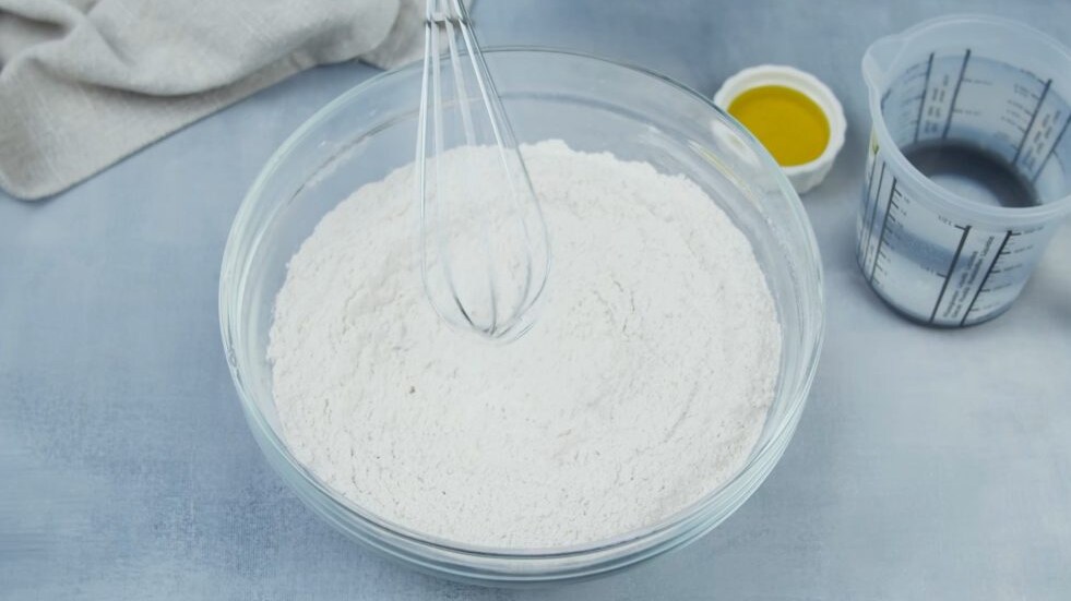 In una ciotola unisci la farina di riso, l’amido di tapioca, la fecola di patate, le bucce di psillio, il lievito di birra secco, le proteine isolate del pisello, lo zucchero e il sale. Mescola per unire gli ingredienti 1.