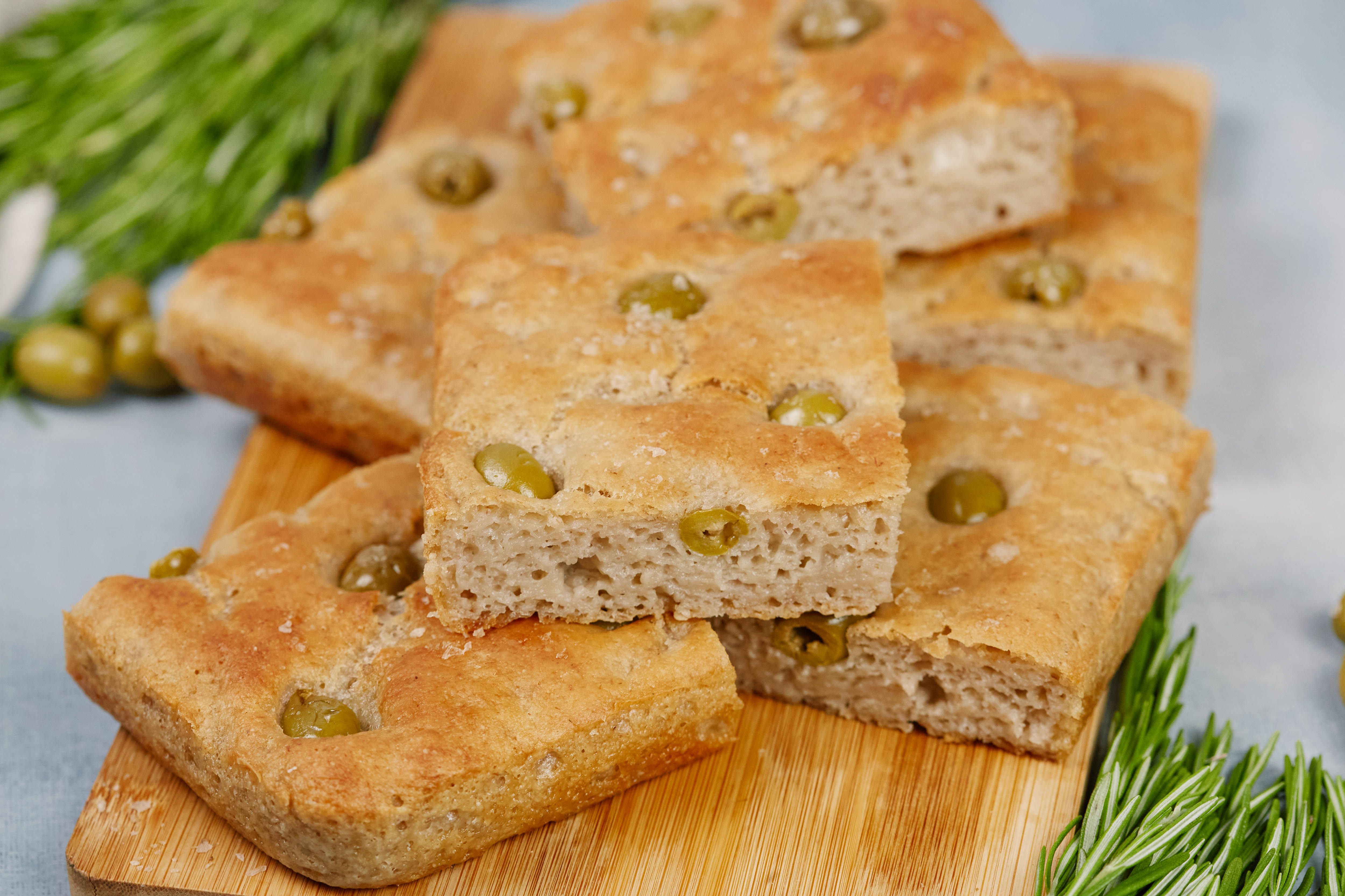 Puoi conservare la focaccia senza glutine per 1 giorno avvolta nella pellicola trasparente.