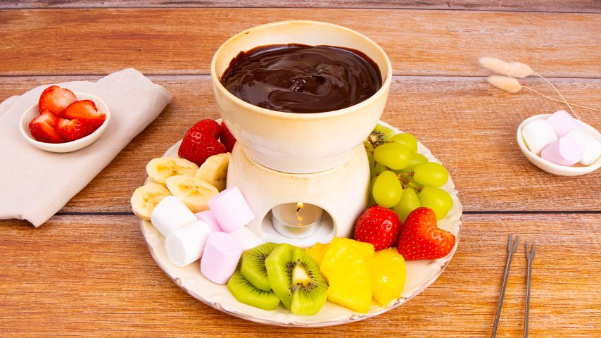 L'importante, una volta sciolto il cioccolato in scaglie nella panna bollente, sarà mantenere la salsa calda e morbida grazie all'apposito fornelletto incluso nel set per fonduta, indispensabile per una riuscita impeccabile della ricetta.