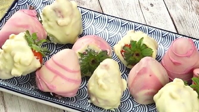 Sciogli i cioccolato bianco e versalo in due ciotole 1. Sciogli il cioccolato rosa e trasferiscilo nel sac à poche. Versa il cioccolato rosa sul bianco della prima ciotolina realizzando delle linee 2. Metti una fragola, precedentemente lavata e asciugata, nello spiedino e intingila nel cioccolato 3. Ripeti l’operazione con metà delle fragole e falle asciugare.