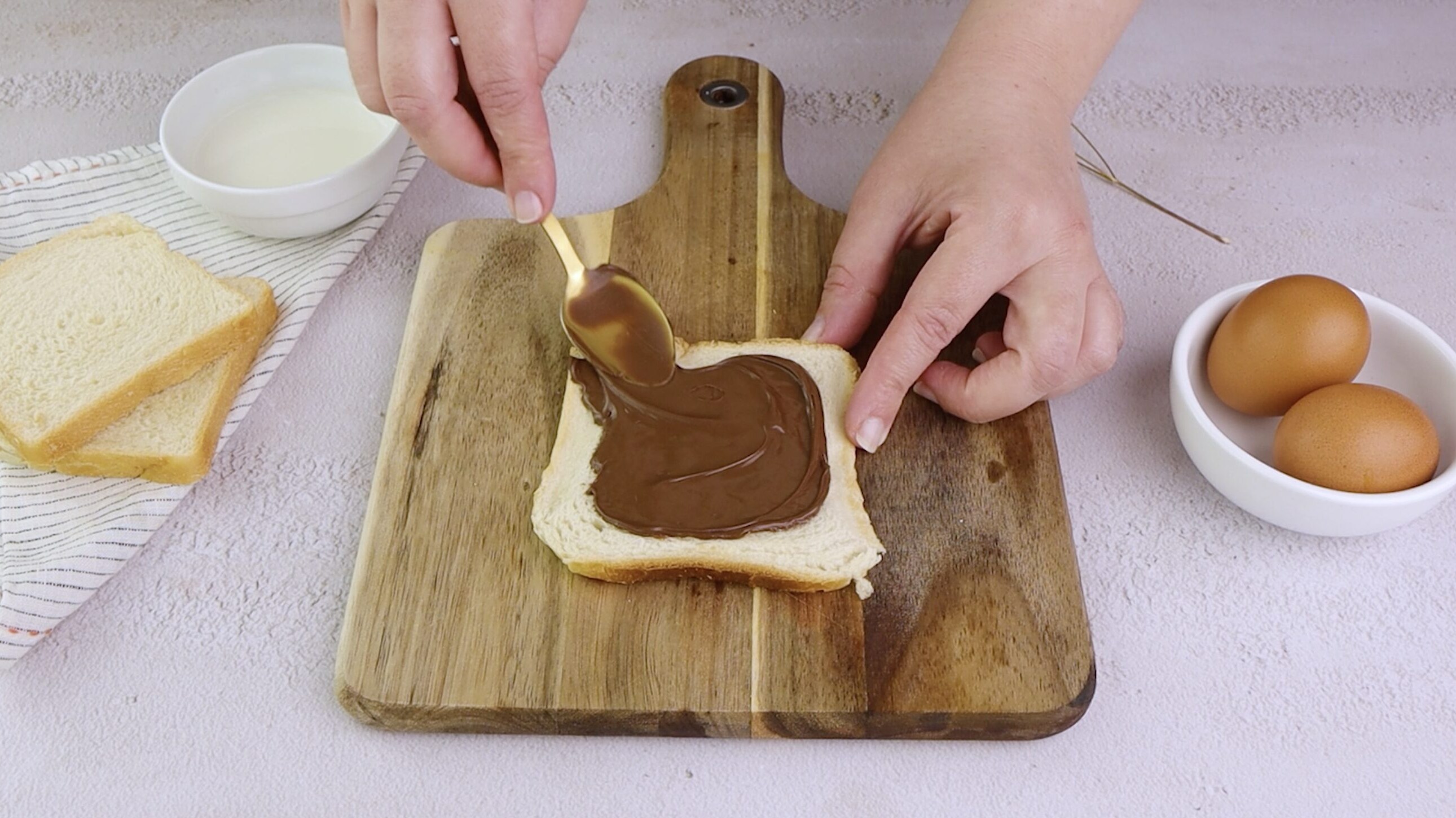 Metti su ciascuna fetta un cucchiaino di crema alle nocciole e spalmalo uniformemente 2.