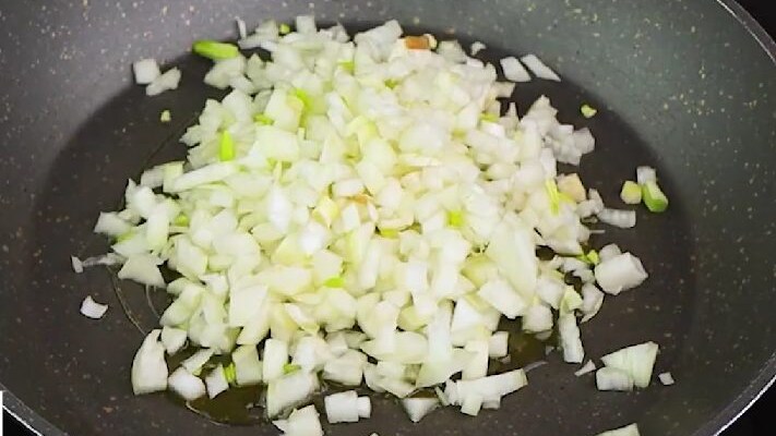 Taglia il cavolo a metà e tritatalo 1. Lessalo nell’acqua per circa 10 minuti 2 e, una volta pronto, strizzalo bene. Versate l’olio nella padella e soffriggete le cipolle tritate 3.