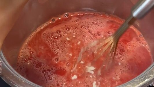 Passa la polpa di anguria al colino 4, pesa 1 l di succo di anguria e mettilo in una pentola 5. Aggiungi l'agar agar 6 e cuoci per 3 minuti.