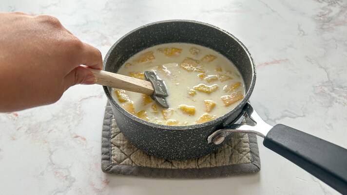 Trasferisci il mango in un pentolino e aggiungi la panna fresca, lo zucchero, il latte e il succo di limone 2.