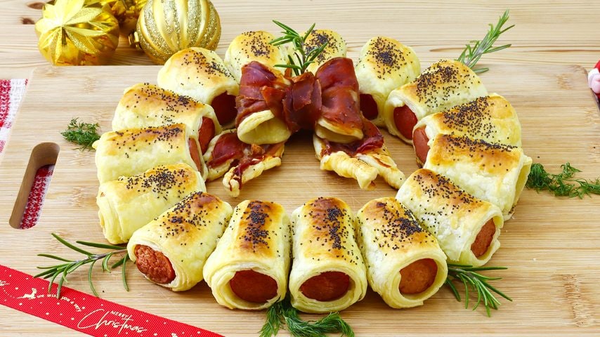 La ghirlanda di würstel è una ricetta perfetta per le feste natalizie, realizzata con pochissimi ingredienti: würstel, prosciutto crudo, pasta sfoglia, un tuorlo e un goccino di latte per spennellare il tutto e semini di papavero a guarnizione.