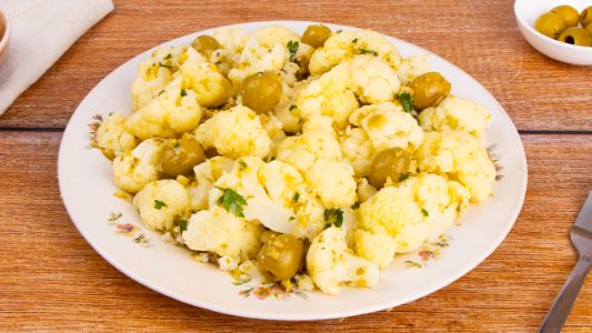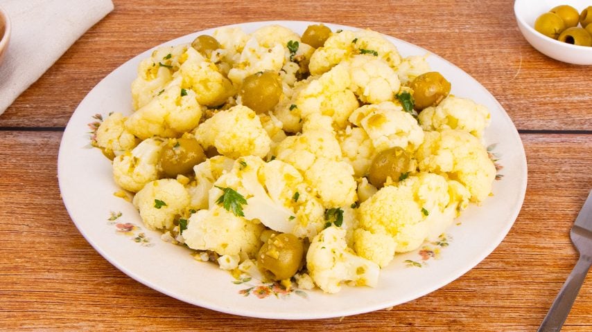 L'insalata di cavolfiore è un contorno semplice e saporito, in grado di conquistare anche chi, solitamente, non gradisce il gusto o l'odore di questo ortaggio invernale, versatile e dagli ottimi benefici per la salute. Si prepara con cimette di cavolfiore, cotte per qualche minuto al vapore e condite poi con una salsina a base di olio extravergine di oliva, capperi, acciughe, prezzemolo fresco, succo di limone, aglio e olive snocciolate.