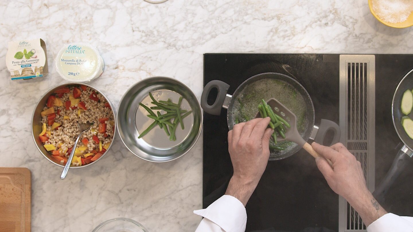 Aiutandoti con un coppapasta componi il piatto: inizia con un letto di fagiolini, aggiungi sopra il farro, quindi le zucchine e la mozzarella. 7