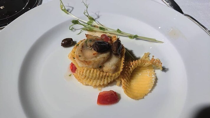Il secondo è stato invece il piatto della serata, sia per preparazione sia per significato storico: Dentice in cesto di patate rosse e salsa alla puttanesca. Il dentice di ottima qualità, con una carne saporita e cotta a puntino, abbracciato da questo cesto di patata rossa (più secca rispetto a quella gialla e quindi consigliabile per le “sculture” col cibo), e sormontato da una splendida salsa alla puttanesca. Questo condimento al Punta Molino non si può sbagliare perché la puttanesca, secondo una delle storie che riguardano la sua nascita, sarebbe nata proprio all’esterno dell’albergo.