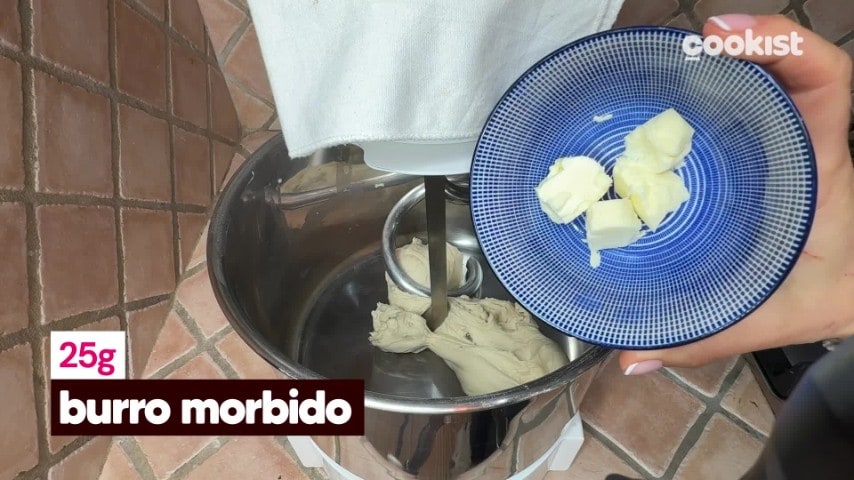 Una volta ottenuto un composto morbido ma non appiccicoso, aggiungi il burro a pezzetti 5, quindi termina con un pizzico di sale.