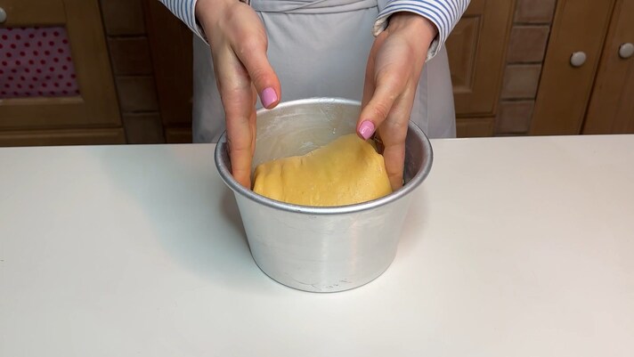 Trasferisci l'impasto su una spianatoia, lavoralo per formare una palla compatta, quindi sistema quest'ultima all'interno dell'apposito stampo da 18 cm di diametro e dai bordi alti e leggermente svasati, già unto abbondantemente di strutto 15.