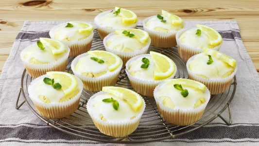 Sforma quindi i muffin su un tagliere e ricoprili con la glassa al limone 10.