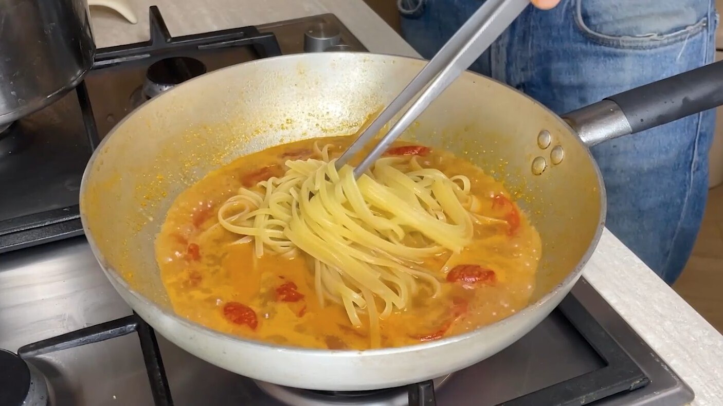 A questo punto lessa le linguine in abbondante acqua bollente salata e scolale 3 minuti prima del tempo indicato sulla confezione, senza buttar via l'acqua di cottura. Trasferiscile nella padella con il sughetto 7 e portale a cottura aggiungendo, se necessario, uno o due mestoli dell'acqua tenuta da parte, il cui amido renderà il condimento ancor più cremoso.