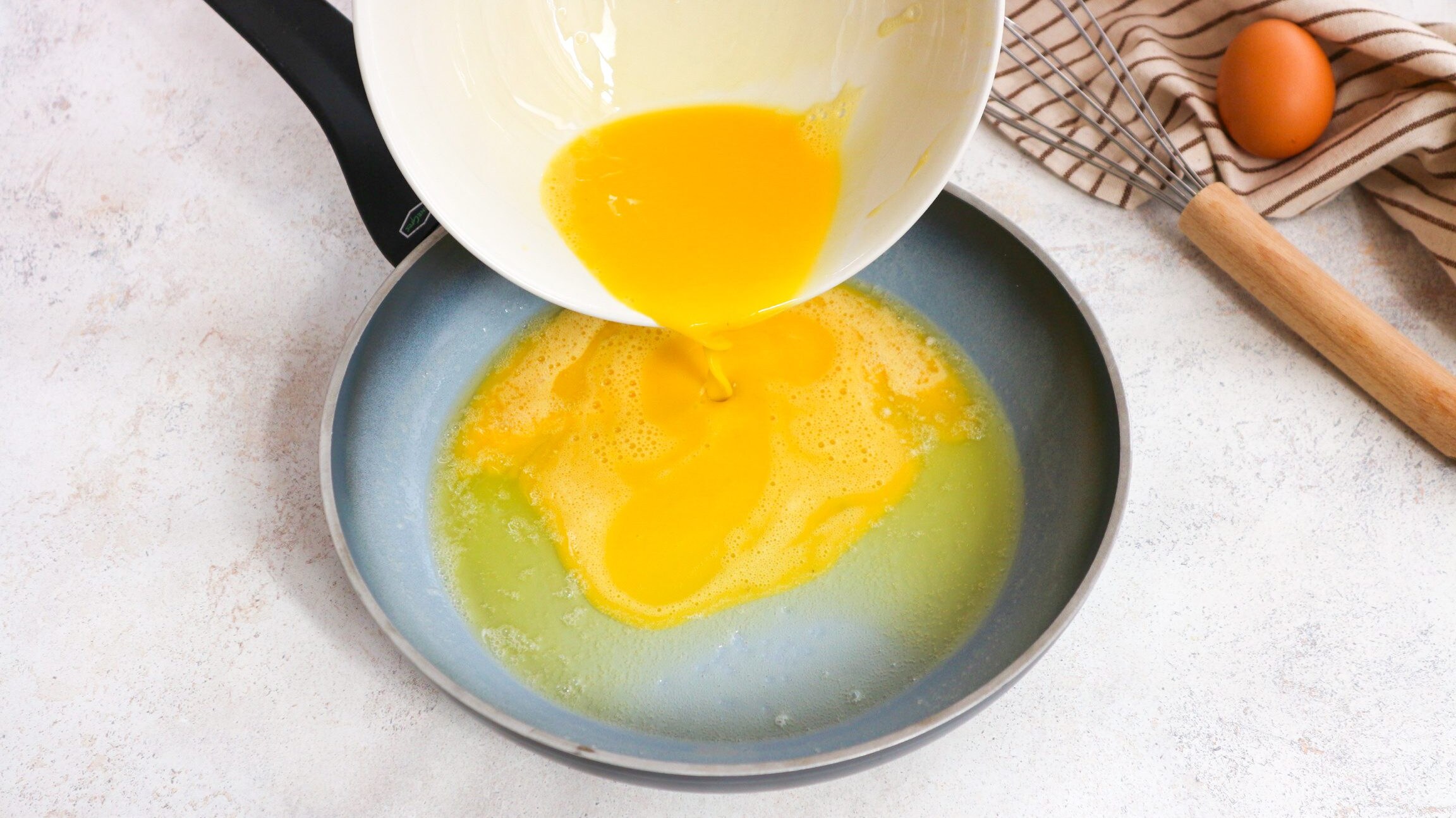 Fai sciogliere il burro in padella e quando è spumoso versa il composto di uova. 2
