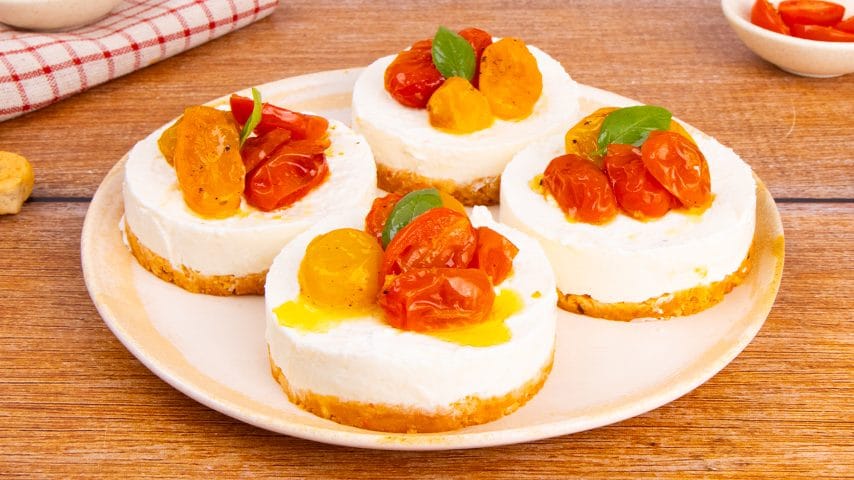 Se dovessero avanzare, le mini cheesecake salate con pomodorini si conservano in frigo, in un contenitore a chiusura ermetica, per 1-2 giorni massimo.