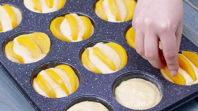 I muffin con pesche sciroppate sono delle tortine morbide e deliziose, ideali per la merenda dei bambini o da servire come squisito dessert a fine pasto. La base dei muffin sarà realizzata con farina, uova, zucchero, lievito in polvere, yogurt, scorza di limone e olio d'oliva, senza burro. L'impasto sarà poi arricchito con fettine di pesche sciroppate in superficie, che renderanno i muffin ancora più soffici e irresistibili.