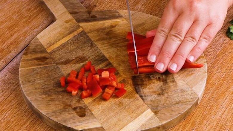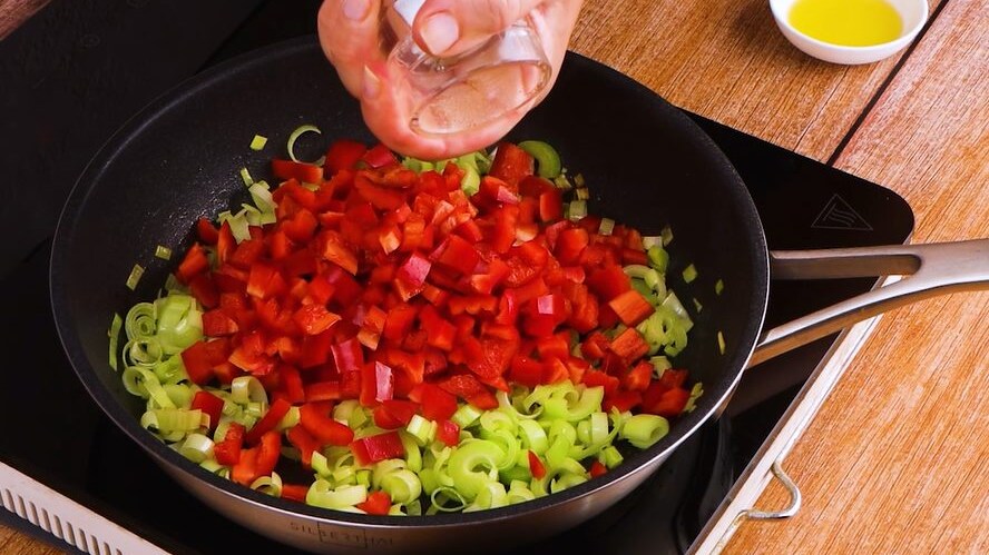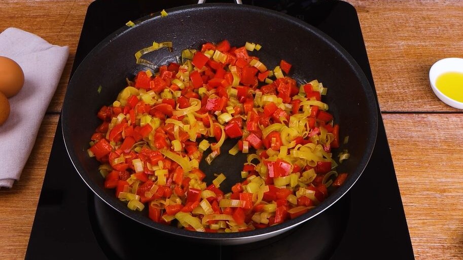 Porro e peperoni saranno cotti per pochi minuti in padella con olio extravergine di oliva, prima di essere aggiunti al resto degli ingredienti.