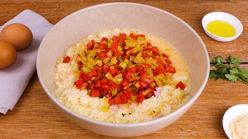 Aggiungi il parmigiano, il prosciutto cotto, il prezzemolo, il porro e i peperoni 6.