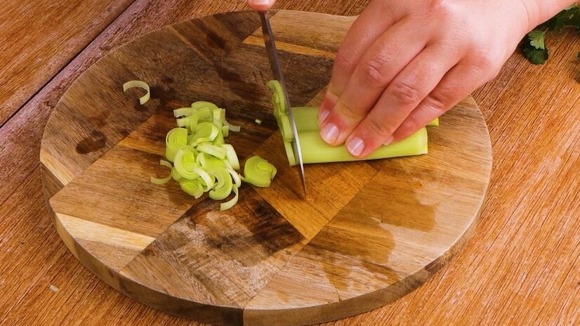Per preparare i muffin di frittata, taglia il porro a fettine 1.