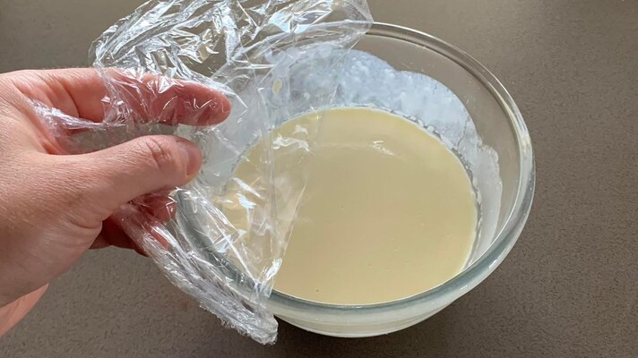 Copri con un foglio di pellicola a contatto 9 e riponi la namelaka in frigorifero a rassodare per almeno 12 ore.