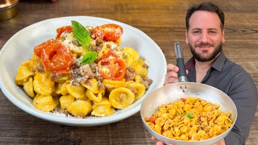 Le orecchiette alla positanese sono un primo cremoso e saporito, tipico, come suggerisce il nome, della zona di Positano, nella Costiera Amalfitana. Le orecchiette, lessate al dente, vengono mantecate in padella con un ricco condimento a base di salsiccia sbriciolata, pomodorini, burrata e basilico fresco, il tutto completato da una manciata generosa di parmigiano grattugiato.